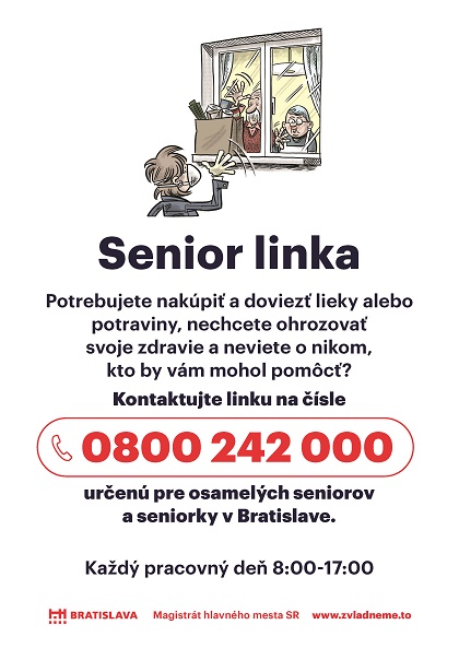 Mesto Bratislava zriadilo pre obmedzenia v súvislosti s novým koronavírusom telefonickú linku pre seniorov. Je dostupná v pracovné dni medzi 8.00 h a 17.00 h na telefónnom čísle 0800 242 000.
