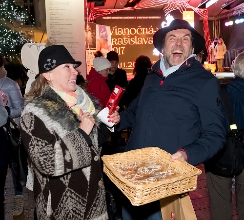 Známi herci a moderátori chodili pomedzi ľudí na Hlavnom námestí a ponúkali medovníkové bábätká.