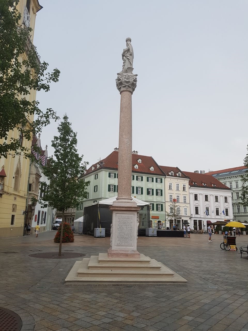 Na Mariánskom stĺpe na Františkánskom námestí, pred Kostolom jezuitov, bolo obnovené štvorstupňové kamenné schodisko, štvorhranný kamenný podstavec s nápismi a reliéfmi, valcový kamenný stĺp a kamenná socha Panny Márie.