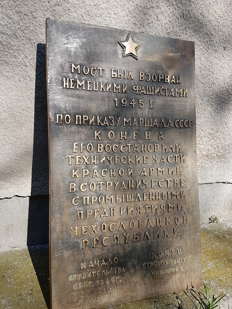 Tá by pripomínala, že ten predošlý postavili na prelome rokov 1945 a 1946 vojaci Červenej armády. Tabuľu ukradli pri rekonštrukcii mosta, skončila v zberných surovinách, odkiaľ ju priniesli na Úrad vlády SR.