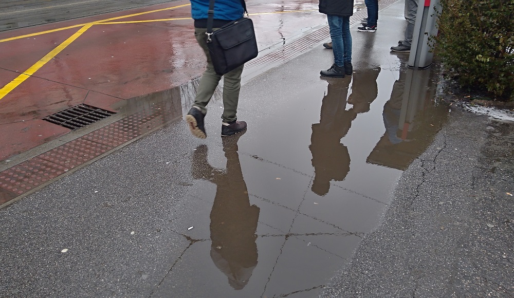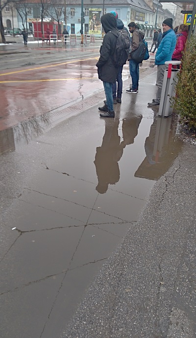 Zrejme zlé vyspádovanie a asfaltovanie sú príčinou tvorby mlák pri daždi na zastávke tzv. Viedenského typu na Radlinského ulici.