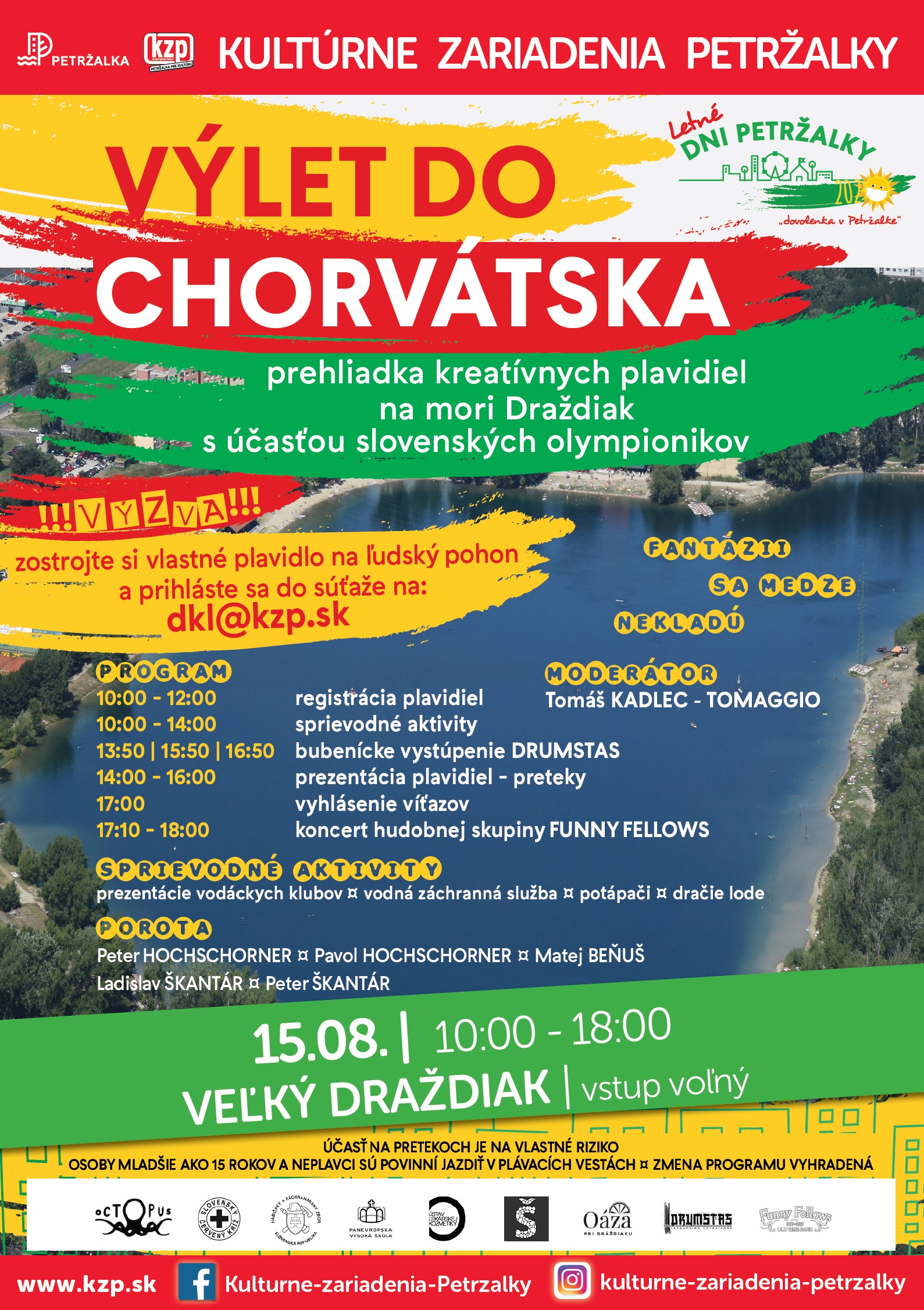 Kultúrne zariadenia Petržalky v spolupráci s mestskou časťou Petržalka pozývajú všetkých na Výlet do Chorvátska. Nemusíte chodiť ďaleko, „petržalské more“ máme hneď za rohom. Už túto sobotu 15.8.2020 je pripravený na Draždiaku bohatý program pre milovníkov vody, slnka a dobrodružstva, ale na svoje si prídu aj všetci zruční majstri, ktorí sa neboja vyrobiť si vlastné plavidlo a vyraziť s ním na vodu!