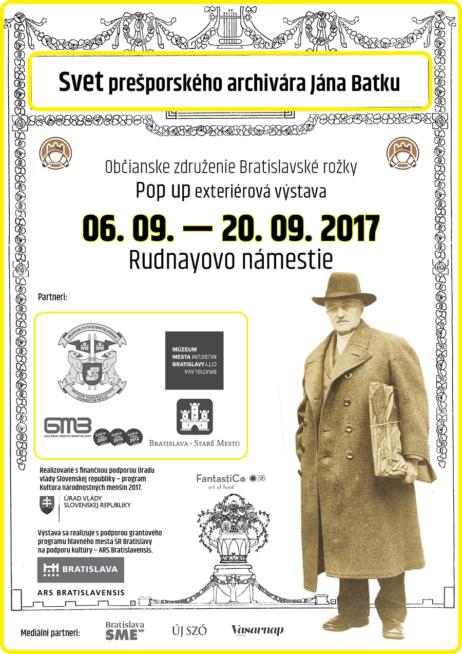 Občianske združenie Bratislavské rožky Vás pri príležitosti 100. výročia úmrtia Jána Batku pozýva na pop up exteriérovú výstavu na Rudnayovom námestí, v Bratislave.
