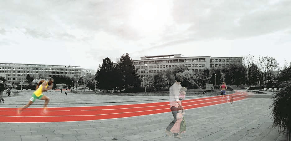 Na Námestí slobody navrhli bežeckú dráhu dlhú 400 metrov. „Tento zámer vyžaduje kvalitný povrch a dobré osvetlenie. Dobrá viditeľnosť rieši zároveň aj bezpečnosť počas nočných hodín,“ uviedli vtedy autori návrhu (vizuál).