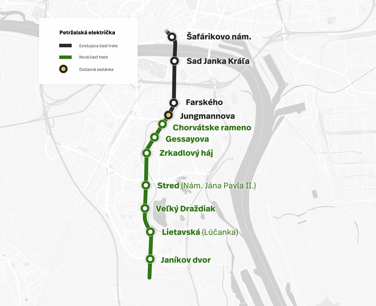 Trať má navrhnutých sedem zastávok s pracovnými názvami Chorvátske rameno, Gessayova, Zrkadlový háj, Stred, Veľký Draždiak, Lietavská a Janíkov dvor. Magistrát deklaruje, že kládol maximálny dôraz na to, aby sa nová električková trať stala súčasťou verejného priestoru.