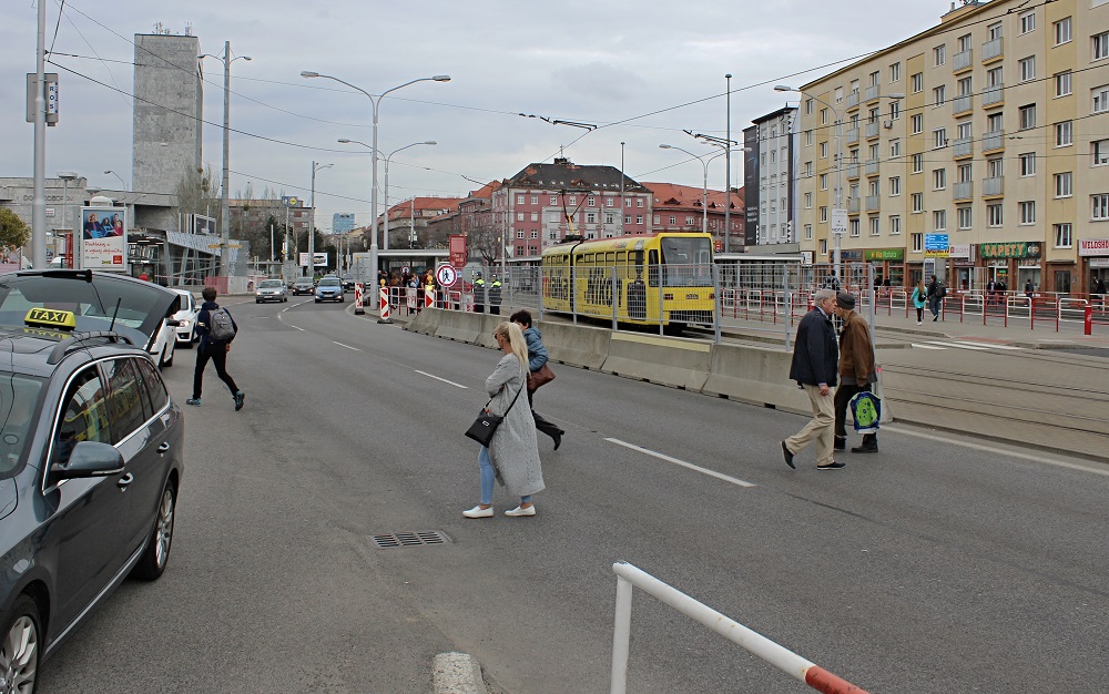 Ani ich prítomnosť a ani betónové zábrany s oplotením, nedokázali odradiť mnohých chodcov, aby prechádzali cez frekventovanú ulicu namiesto toho, aby zo strany tržnice použili už sprístupnený vchod do podzemia podchodu (titulná foto).
