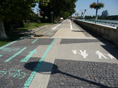 Zóna zmiešaného pohybu chodcov a cyklistov na promenáde medzi Mostom SNP a Mostom Lafranconi v Bratislave je dočasné riešenie na obdobie jedného roka.