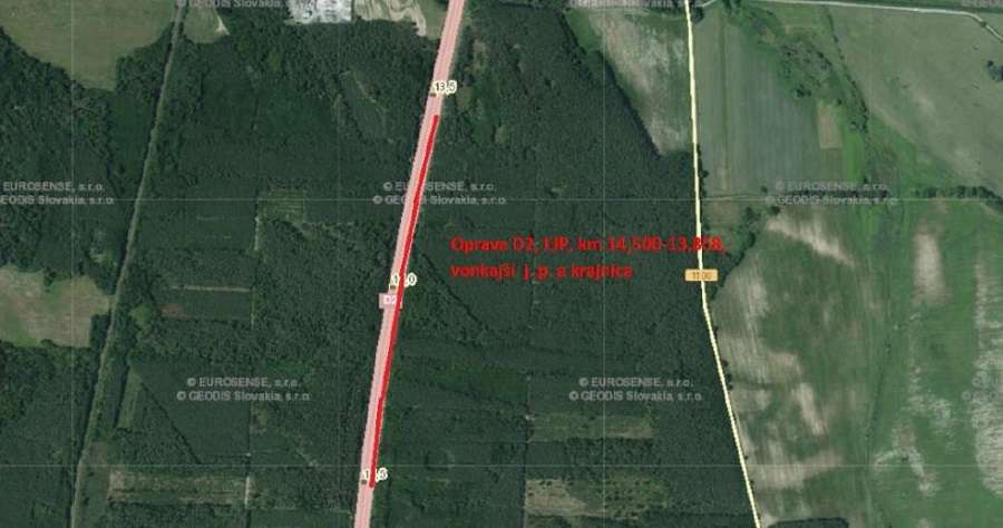 to bude úsek Malacky - Kúty, vonkajší jazdný pruh a krajnica ľavého jazdného pásu (smer Brno) v km 14,500 - 13,858