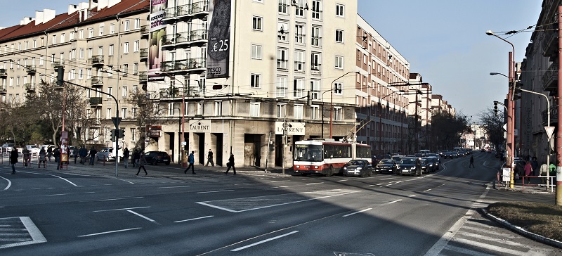 Podľa Zelenej vlny RTVS jeden pruh v križovatke v smere z Trnavského mýta na Hlavnú stanicu blokuje trolejbus.