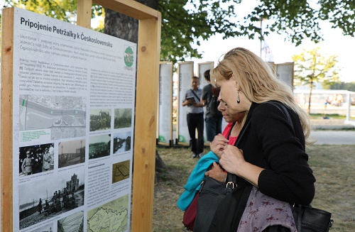 Program prebiehal aj na Magio pláži, kde starosta spolu s riaditeľkou Miestnej knižnice Petržalka Katarínou Bergerovou otvorili putovnú výstavu k 100. výročiu.