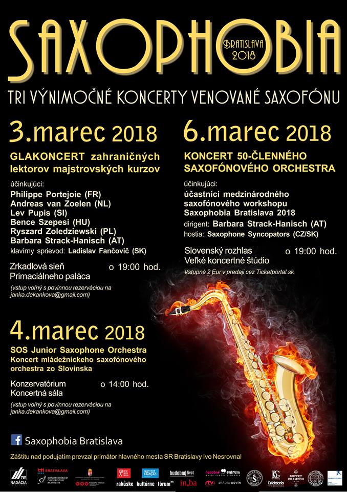 V týchto dňoch si na saxofóne zahrá viac ako 50 študentov zo 6 krajín. Nebudú chýbať ani klasické koncerty v sobotu 3.marca v Zrkadlovej sieni, v nedeľu 4.marca v koncertnej sále Konzervatória a na záver v utorok 6.marca v Slovenskom rozhlase v Bratislave.