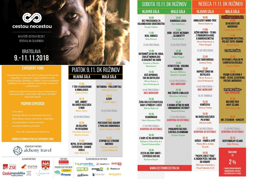 Na programe budú tiež prezentácie ako 4260 km PCT trail z Mexika do Kanady, Afrika na bicykli, KE - Pamír a späť na starom mercedese, Jamajka, Z Kuby na Antarktídu, Zóna smrti - Expedícia Cho Oju, Stopom cez Strednú Ameriku, Naprieč Čínou na bicykloch, Kamčatka, Azory, Botswana, ale aj premietania v 3D.