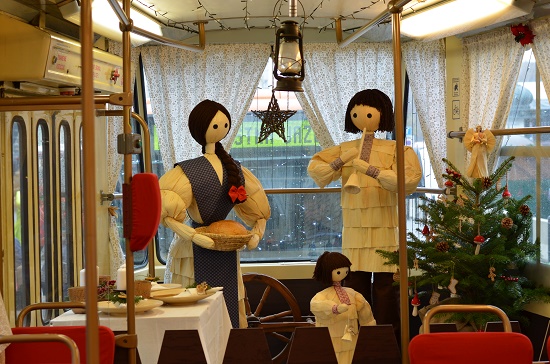 Do električky boli zhotovené postavy zo šúpolia v životnej veľkosti, ktoré majú pripomínať slovenskú rodinu počas sviatkov.