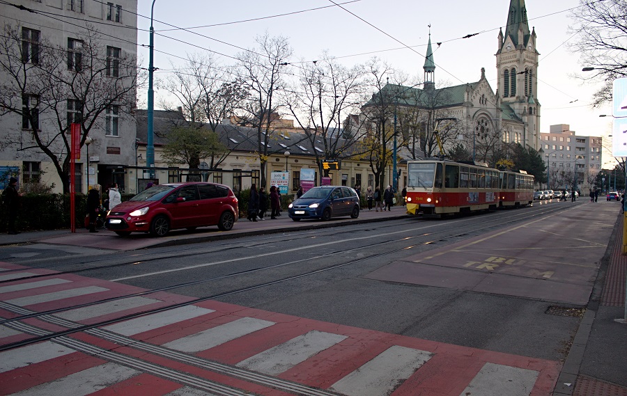 Prídem z Vazovovej ulice a na zastávku ide električka, alebo autobus. Zastavím za priechodom pre chodcov - viem, že by som nemal, ale viem ako to chodí...