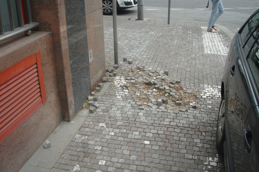 A to je len jeden príklad za všetky tie desiatky ( a možno stovky ) poškodených chodníkov a dlažieb len v Starom Meste ( o vozovkách nehovoriac ) napr. na Nám. SNP krátky chodník oproti Hlav. pošty od stanovišťa taxi poza partizána je rozbitý už najmenej 10 rokov. Nikomu to zjavne nevadí