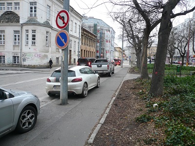 Obr.1 - Koniec Záhradníckej ulice pri Odborárskom námestí, pri parčíku, za značkou Zákaz parkovania, parkujú denne 3 - 4 autá nie 5 minút, ale celé hodiny, ba celý deň