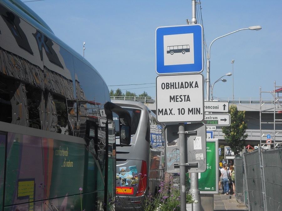 Na strane pod hotelom Park Inn Danube, je to posvätené dopravnou značkou, kde kompetentný úradník,v snahe vyhovieť lenivým turistom spôsobil, že vodiči/cyklisti a ostatní účastníci cestnej premávky sú denne vystavení riziku, ktoré je spôsobené prekážkou v odbočovacom pruhu, tvorenou parkujúcimi turistickými autobusmi. Interval 10 min. max je len pro forma, z vodičov turistických autobusov,to prakticky žiadny nerešpektuje.