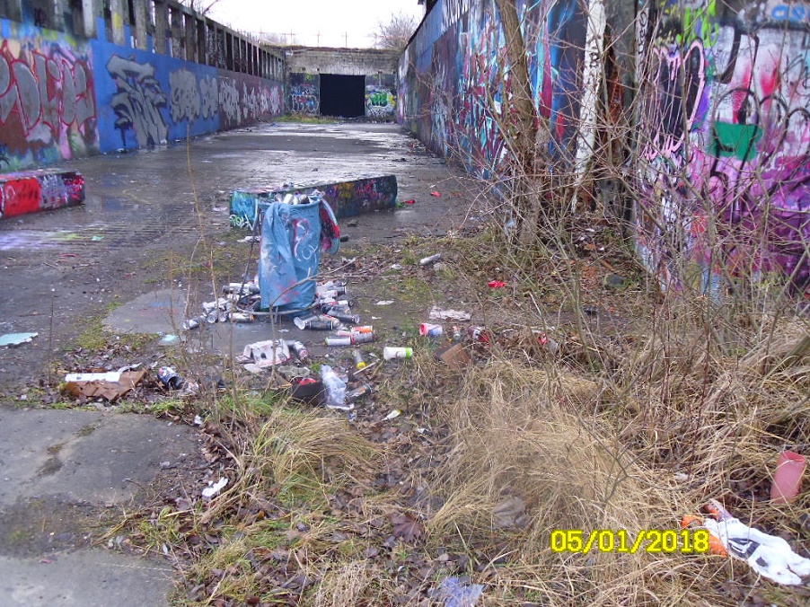 Nachádza sa tu množstvo prázdnych, alebo úplne nepoužitých obalov rôznych veľkostí, od chemických sprejových farieb, rozpúšťadiel, činidiel, čističov a iných nebezpečných toxických kvapalín, bez ochranných uzáverov, ktoré boli použité pri nezmyselných a abstraktných maľbách na oporných betónových pilieroch tohto viaduktu.